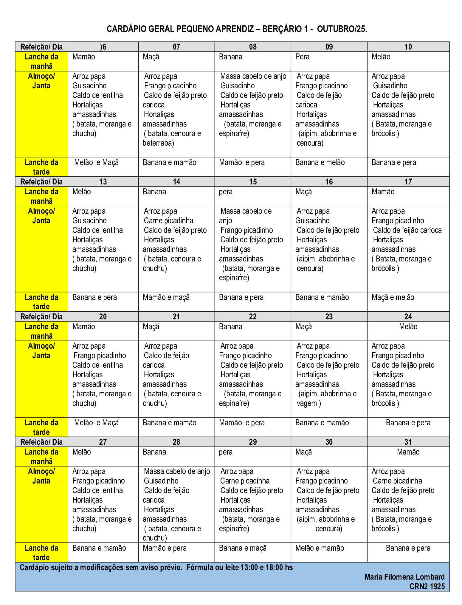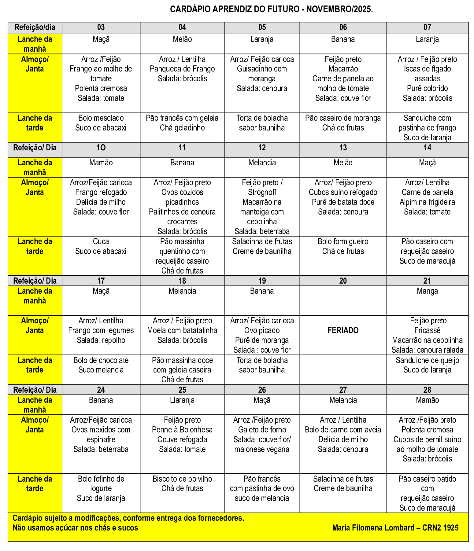 - Cardápio sujeito à modificações, conforme entrega dos fornecedores.