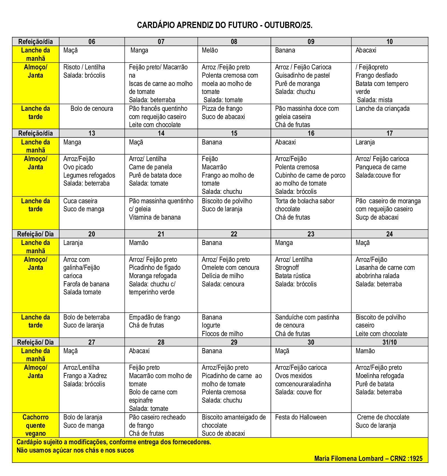 Cardápio sujeito a modificações sem aviso prévio. Fórmula ou leite 13:00 e 18:00hs.