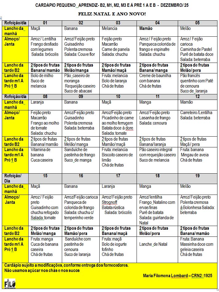 - Cardápio sujeito à modificações, conforme entrega dos fornecedores.